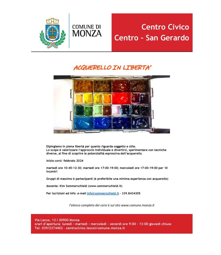 Nuovi corsi di acquerello presso il Centro Civico in via Lecco a Monza Posted byacquarellistaApril 15, 2024October 27, 2024Posted inUncategorized Share this: Click to share on X (Opens in new window) X Click to share on Facebook (Opens in new window) Facebook Like Loading... Related